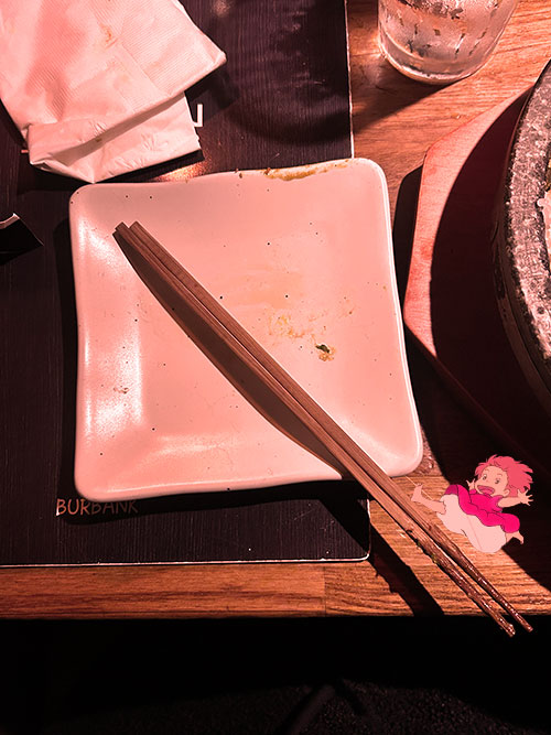 Quenched for thirst and hunger. Ponyo comes across gyoza. YUMMMM. She devoured them. Although, she misses the ramen that Sosuke's mom made, so warm and comforting.